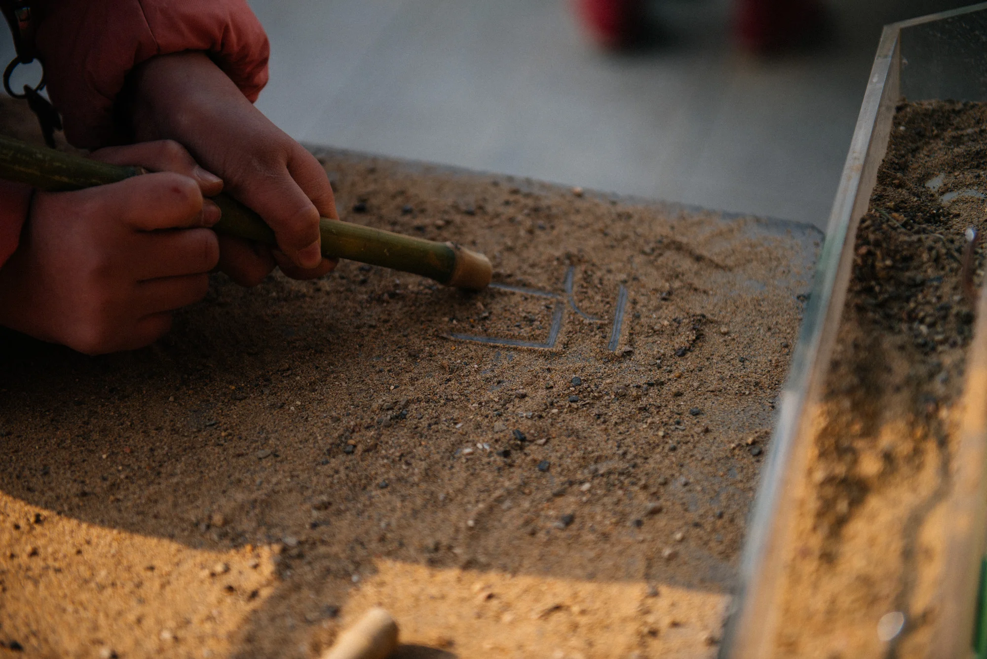 Behind the temple there is a museum with activities for children. Here a child inscribes in sand the word stone (石 ).
