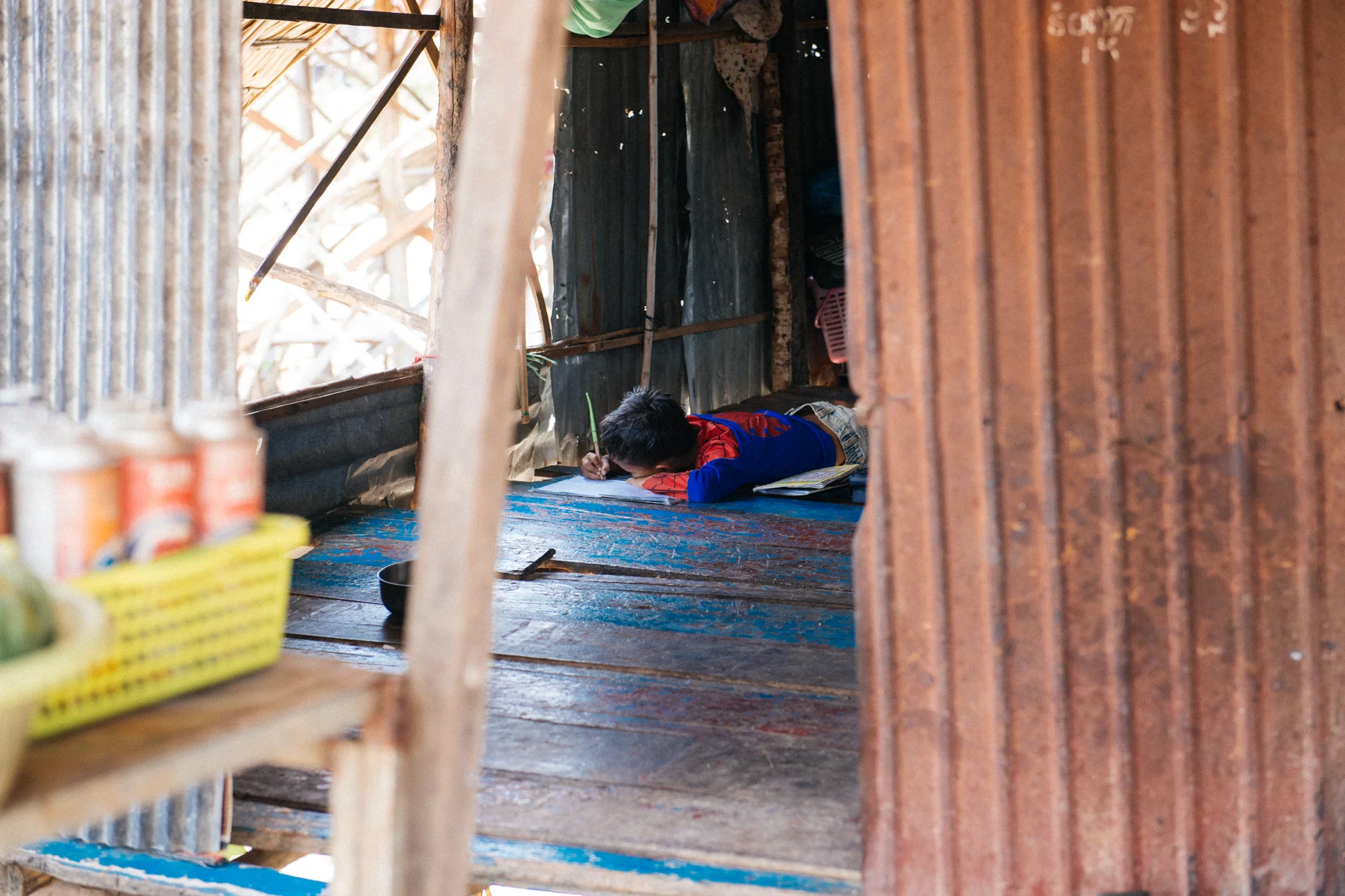 While the other kids played outside in the water, this boy stayed inside attentively doing his homework. In the nearby floating village and at the Angkor Wat parks, many children work selling souvenirs to tourists instead of going to school.