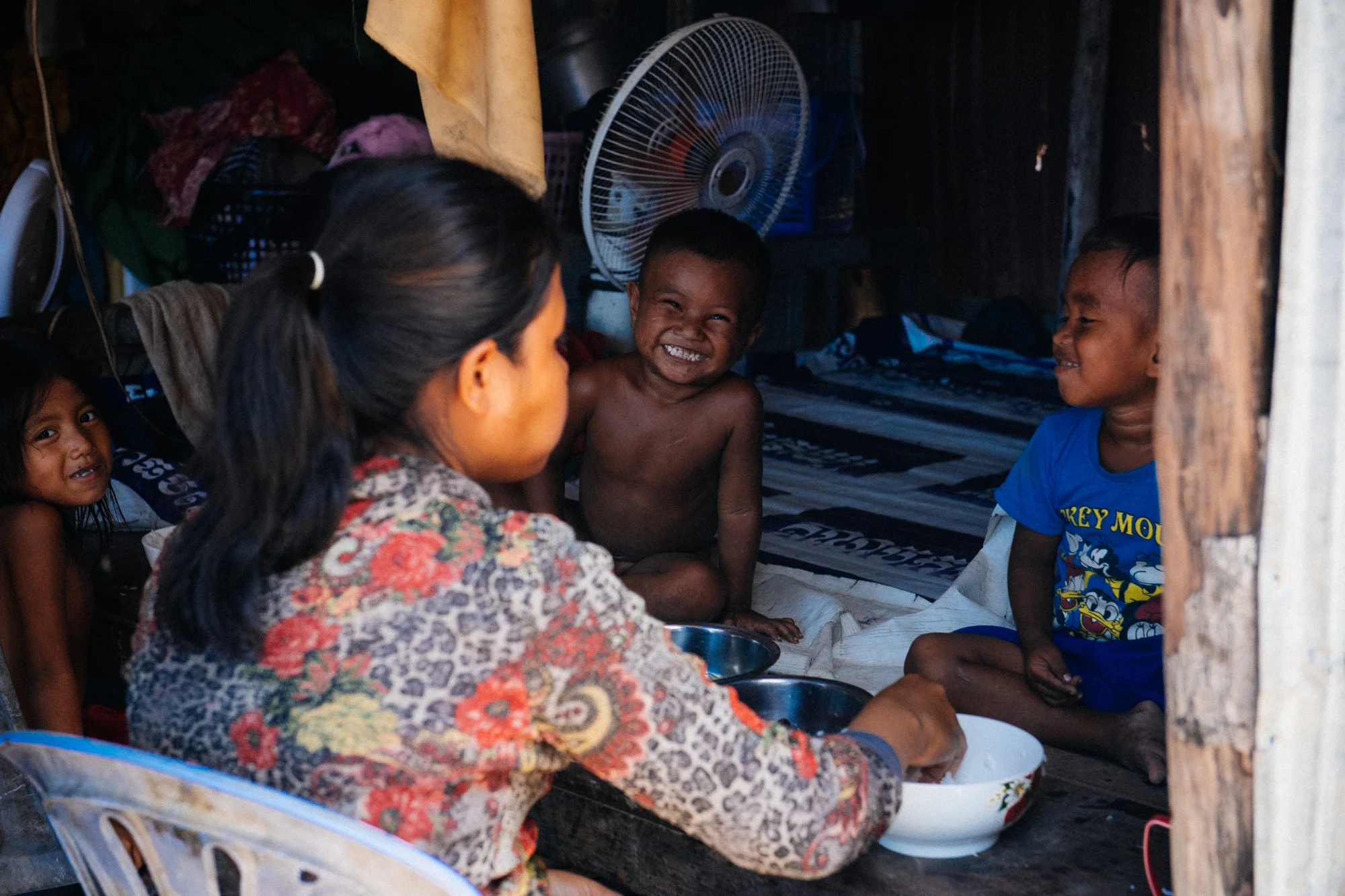 Three kids have lunch with their caretaker. The most instinctive reaction of the little boys was to laugh so hard and wave to the camera as soon as he noticed our presence.